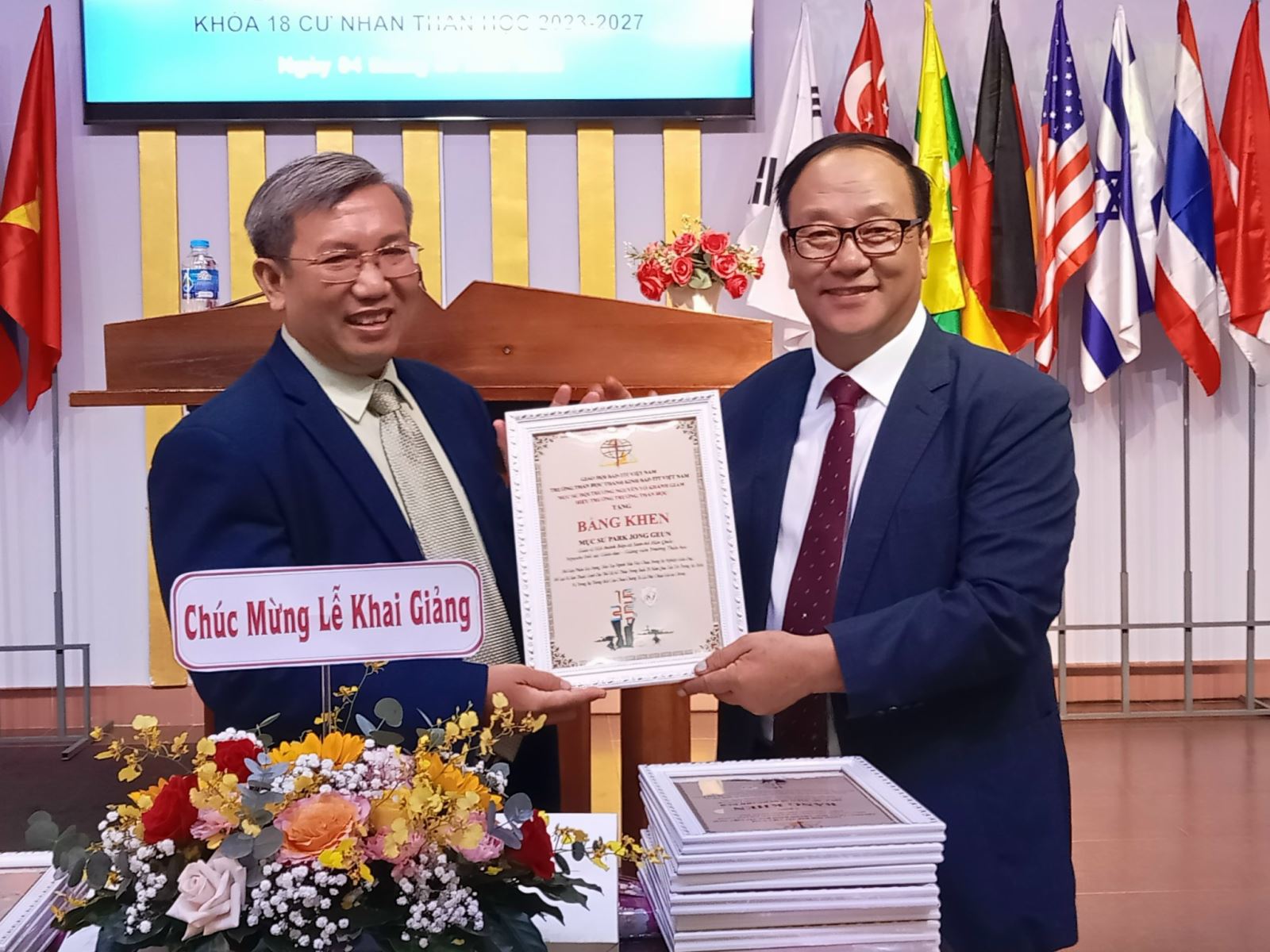 Mục sư Nguyễn Võ Khánh Giám (Hiệu trưởng) tặng Bằng khen và Kỷ Niệm chương cho các Giáo sư Hàn Quốc